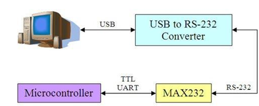 MAX 232 IC由两个发射器 - 接收器布置组成,使得可以使用相同的芯片连接两个串口。每个1microfarad的5个电容器用于从TTL / CMOS电压产生所需的RS232标准电压。发射机将TTL / CMOS级别转换为RS232级,而接收器接收RS232输入并将其转换为TTL电平电压。